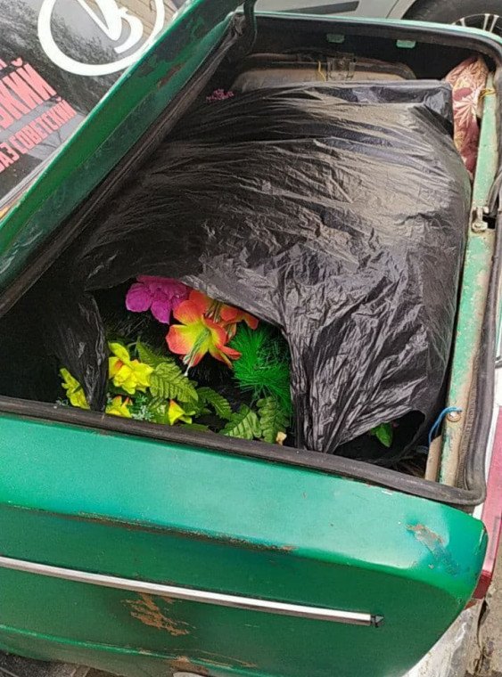 Как сообщили правоохранители, злоумышленники средь бела дня заехали на территорию комплекса и начали быстро собирать оставленные гражданами цветы и венки, укладывая их в багажник.