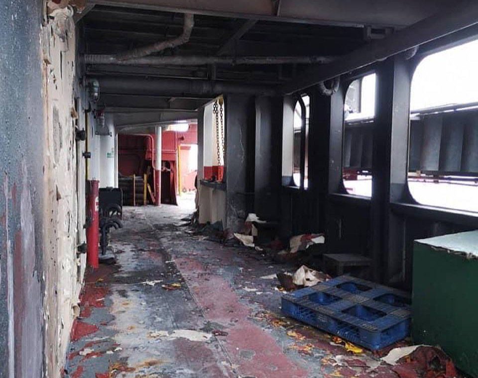 Сейчас вся команда располагается на борту аварийного судна, которое пока находится на буксире. Люди без связи, без пресной воды, питаются сухим пайком. Поскольку всё сгорело, экипаж спит на палубе.