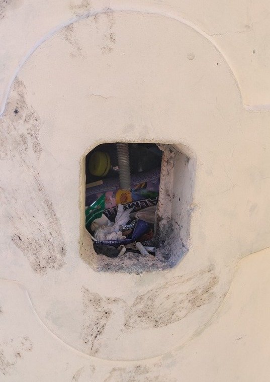 Несмотря на то, что отверстие в столбе чрезвычайно мало, «умельцы» смогли засунуть в него различные бытовые отходы — стаканчики, фантики и бутылки.