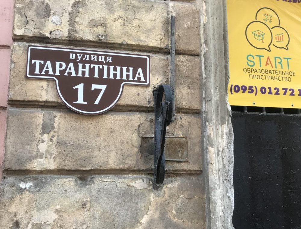 На одном из домов в Одессе появилась табличка с надписью: «Тарантинная, 17». Она находится на созвучной по названию улице — Карантинной, 17. И да, это отсылка к фамилии известного режиссера Квентина Тарантино.