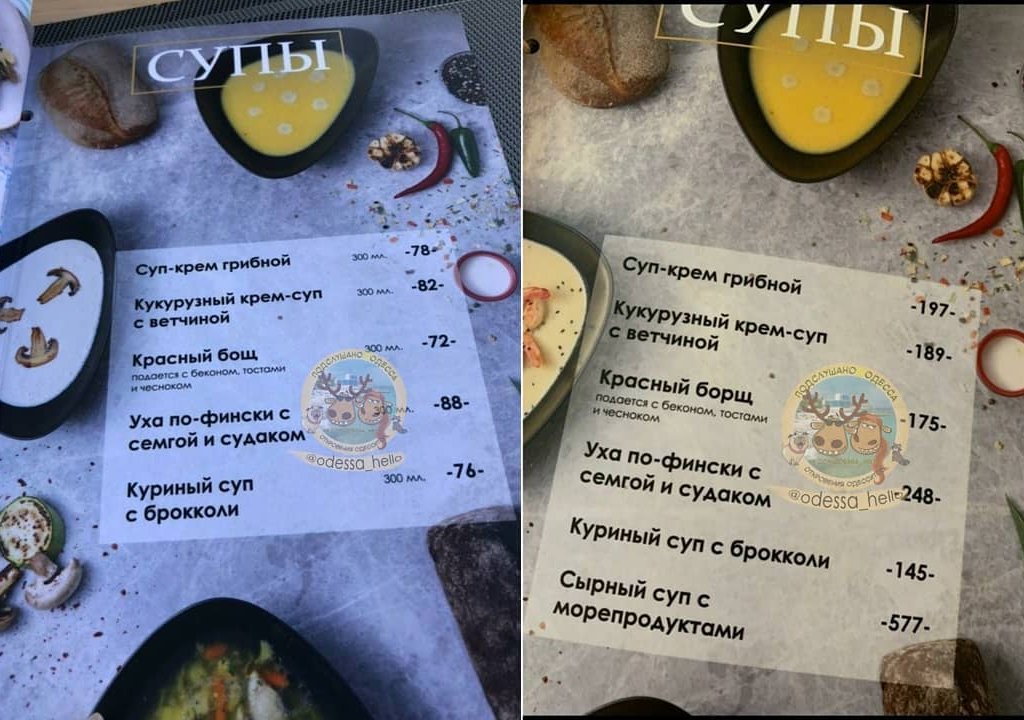 При этом цены в каждом из них отличаются в два-три раза. Так в «дорогом» меню уха стоит 248, суп 197, борщ 175, нарезка 707 гривен.