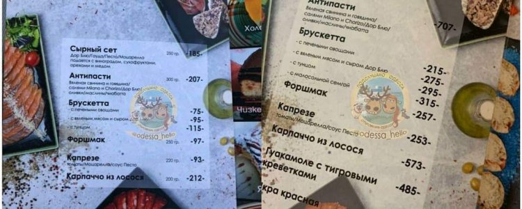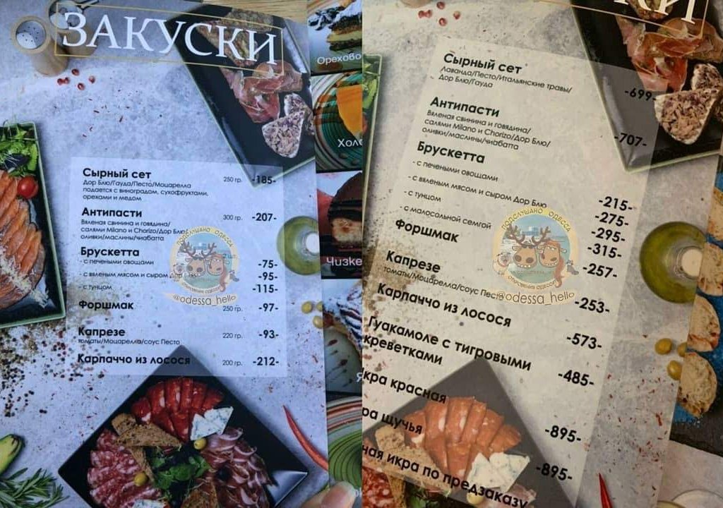 На странице«Подслушано Одесса» в Фейсбуке пользователи показали фото двух меню из заведения Selfie cafe на улице Бунина.