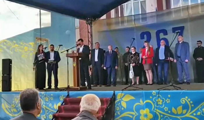 Поздравление было написано на украинском языке и мэр не мог прочитать его без ошибок и запинок. Не помогли даже очки. Мэр спотыкался в тексте почти на каждой строчке. В соцсетях пользователи сравнили мэра с экс-премьер министром Украины Николаем Азаровым, который также испытывал сложности с украинским языком.