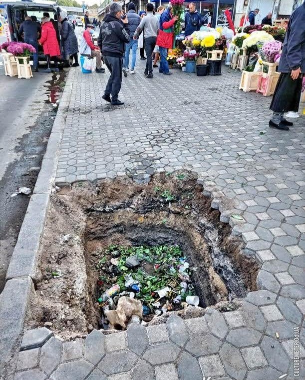 КП “Горзелентрест” планирует высадить здесь 14 деревьев, которых так всегда не хватало летом в жару. 2 недели назад были выкопаны лунки, но деревья так и не высадили. Но за этот промежуток времени лунки закидали мусором прохожие и продавцы с рынка. Удивительно, как наши люди воспринимают любую яму местом для выброса мусора.