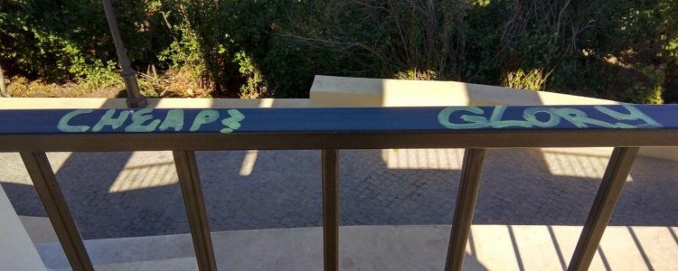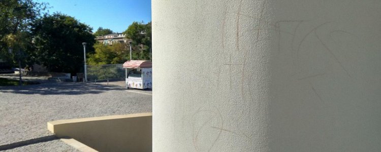 На одной из колонн появилась надпись. Сделали ее чем-то вроде карандаша, но не маркером. Есть одна надпись и на перилах.