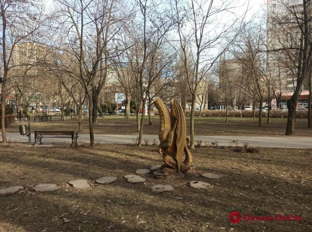 Деревянная скульптура дракона в сквере на 7-й станции Большого Фонтана в Одессе пострадала на днях от вандалов — неизвестные отрезали ей голову, и теперь всю фигуру планируется заменить.